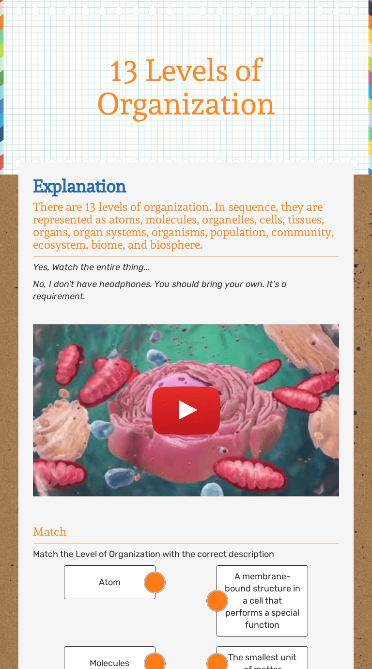Assigning organs to organ systems can be imprecise since organs that "belong" to one system can also have functions … Atom, molecule, organelle, cells, tissues, organs, organ systems, organisms;.. Make sure to include a description under each drawing describing what is happening scientifically and a caption relating the emotions of the atom.